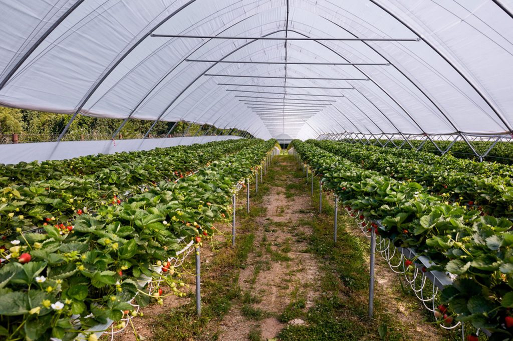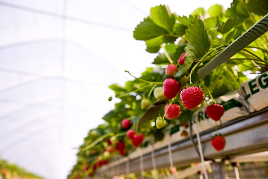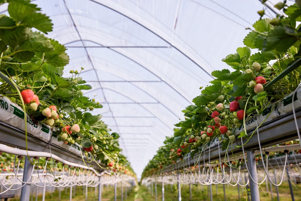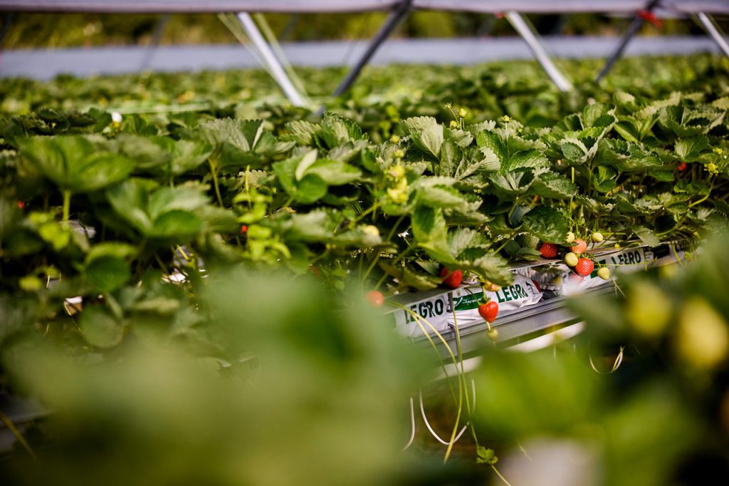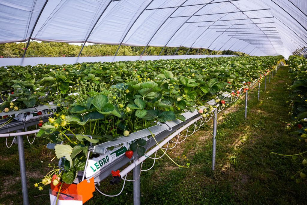 Truskawka hodowana jest w tunelach, w macie kokosowej, na rynnach o wysokości około 150cm